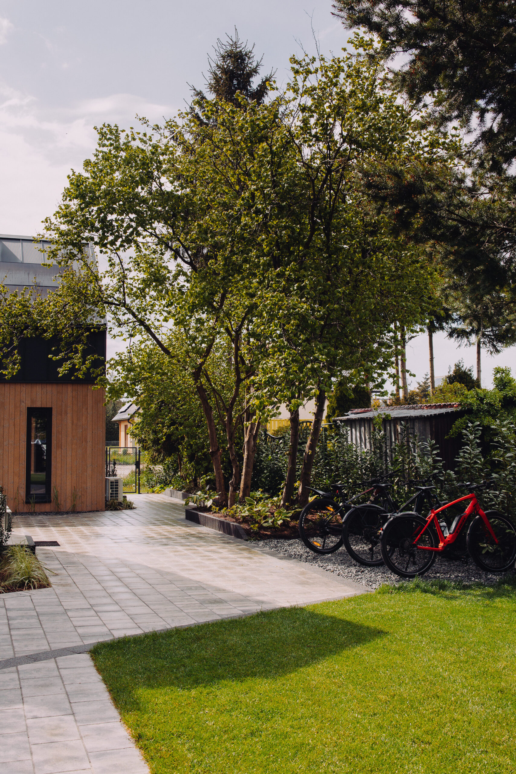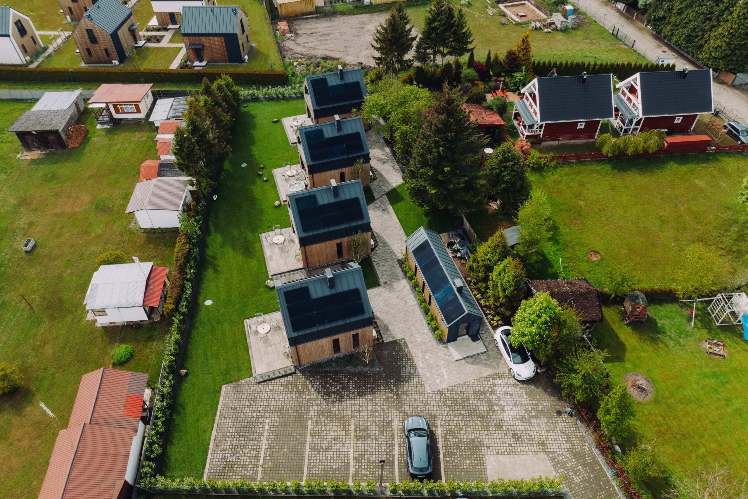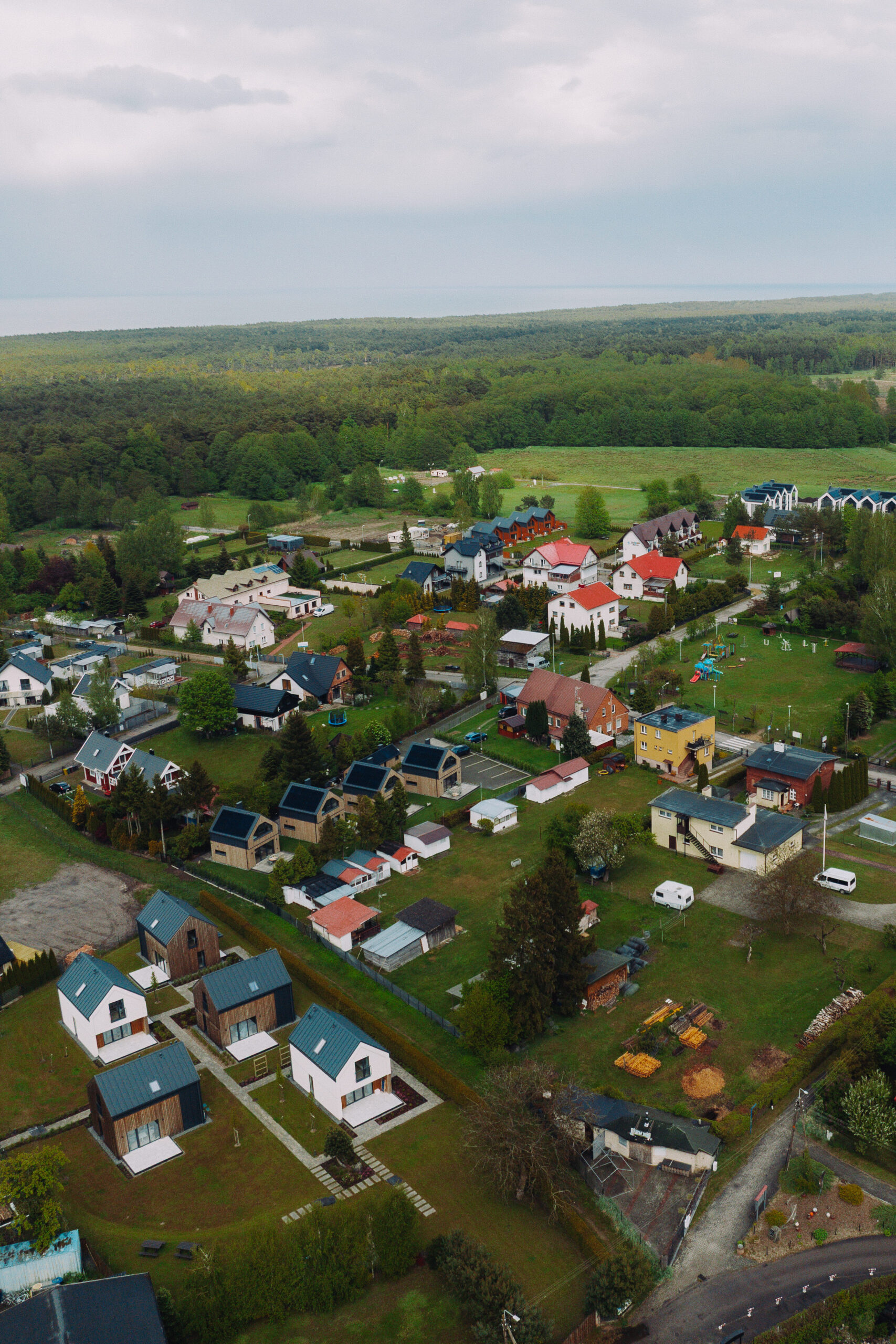 Każdy domek otoczony jest zielenią i przestrzenią, zapewniając prywatność i spokój. Na terenie ośrodka znajdziesz też miejsce na ognisko, plac zabaw oraz rowery dostępne dla gości.