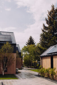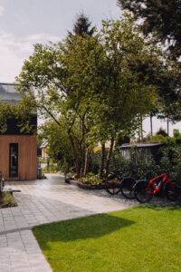 Każdy domek otoczony jest zielenią i przestrzenią, zapewniając prywatność i spokój. Na terenie ośrodka znajdziesz też miejsce na ognisko, plac zabaw oraz rowery dostępne dla gości.